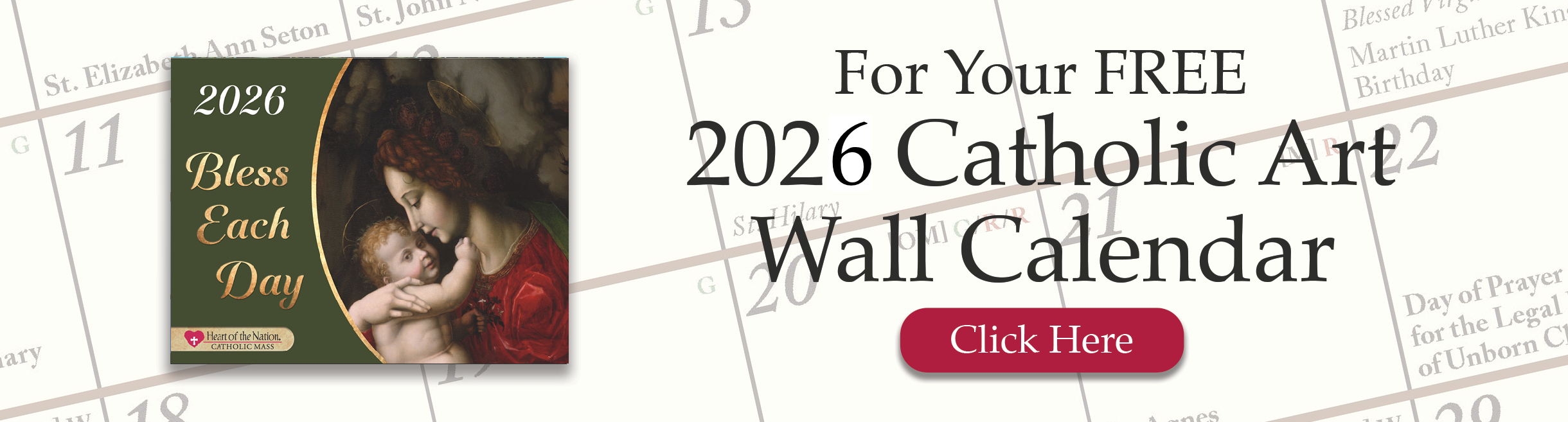 Please fill out the form below to receive your copy of the 2026 Heart of the Nation Catholic Art Wall Calendar. Limit one calendar per household. Please allow 4-6 weeks for delivery. First Name*Middle NameLast Name*Mailing Address*City*State*State *ALAKAZARAAAEAPCACOCTDCDEFLGAHIIDILINIAKSKYLAMEMDMAMIMNMSMOMTNENVNHNJNMNYNCNDOHOKORPARISCSDTNTXUTVTVAWAWVWIWYZIP Code*CountryCountryAfghanistanAlbaniaAlgeriaAmerican SamoaAndorraAngolaAnguillaAntarcticaAntigua and BarbudaArgentinaArmeniaArubaAustraliaAustriaAzerbaijanBahamasBahrainBangladeshBarbadosBelarusBelgiumBelizeBeninBermudaBhutanBoliviaBonaire, Sint Eustatius and SabaBosnia and HerzegovinaBotswanaBouvet IslandBrazilBritish Indian Ocean TerritoryBrunei DarussalamBulgariaBurkina FasoBurundiCambodiaCameroonCanadaCape VerdeCayman IslandsCentral African RepublicChadChileChinaChristmas IslandCocos IslandsColombiaComorosCongo, Democratic Republic of theCongo, Republic of theCook IslandsCosta RicaCroatiaCubaCuraçaoCyprusCzech RepublicCôte d'IvoireDenmarkDjiboutiDominicaDominican RepublicEcuadorEgyptEl SalvadorEquatorial GuineaEritreaEstoniaEswatini (Swaziland)EthiopiaFalkland IslandsFaroe IslandsFijiFinlandFranceFrench GuianaFrench PolynesiaFrench Southern TerritoriesGabonGambiaGeorgiaGermanyGhanaGibraltarGreeceGreenlandGrenadaGuadeloupeGuamGuatemalaGuernseyGuineaGuinea-BissauGuyanaHaitiHeard and McDonald IslandsHoly SeeHondurasHong KongHungaryIcelandIndiaIndonesiaIranIraqIrelandIsle of ManIsraelItalyJamaicaJapanJerseyJordanKazakhstanKenyaKiribatiKuwaitKyrgyzstanLao People's Democratic RepublicLatviaLebanonLesothoLiberiaLibyaLiechtensteinLithuaniaLuxembourgMacauMacedoniaMadagascarMalawiMalaysiaMaldivesMaliMaltaMarshall IslandsMartiniqueMauritaniaMauritiusMayotteMexicoMicronesiaMoldovaMonacoMongoliaMontenegroMontserratMoroccoMozambiqueMyanmarNamibiaNauruNepalNetherlandsNew CaledoniaNew ZealandNicaraguaNigerNigeriaNiueNorfolk IslandNorth KoreaNorthern Mariana IslandsNorwayOmanPakistanPalauPalestine, State ofPanamaPapua New GuineaParaguayPeruPhilippinesPitcairnPolandPortugalPuerto RicoQatarRomaniaRussiaRwandaRéunionSaint BarthélemySaint HelenaSaint Kitts and NevisSaint LuciaSaint MartinSaint Pierre and MiquelonSaint Vincent and the GrenadinesSamoaSan MarinoSao Tome and PrincipeSaudi ArabiaSenegalSerbiaSeychellesSierra LeoneSingaporeSint MaartenSlovakiaSloveniaSolomon IslandsSomaliaSouth AfricaSouth GeorgiaSouth KoreaSouth SudanSpainSri LankaSudanSurinameSvalbard and Jan Mayen IslandsSwedenSwitzerlandSyriaTaiwanTajikistanTanzaniaThailandTimor-LesteTogoTokelauTongaTrinidad and TobagoTunisiaTurkeyTurkmenistanTurks and Caicos IslandsTuvaluUS Minor Outlying IslandsUgandaUkraineUnited Arab EmiratesUnited KingdomUnited StatesUruguayUzbekistanVanuatuVenezuelaVietnamVirgin Islands, BritishVirgin Islands, U.S.Wallis and FutunaWestern SaharaYemenZambiaZimbabweÅland IslandsPhone Number*Email* Offer CodeSourceAny details entered on this page will not be utilized to initiate SMS. Δ